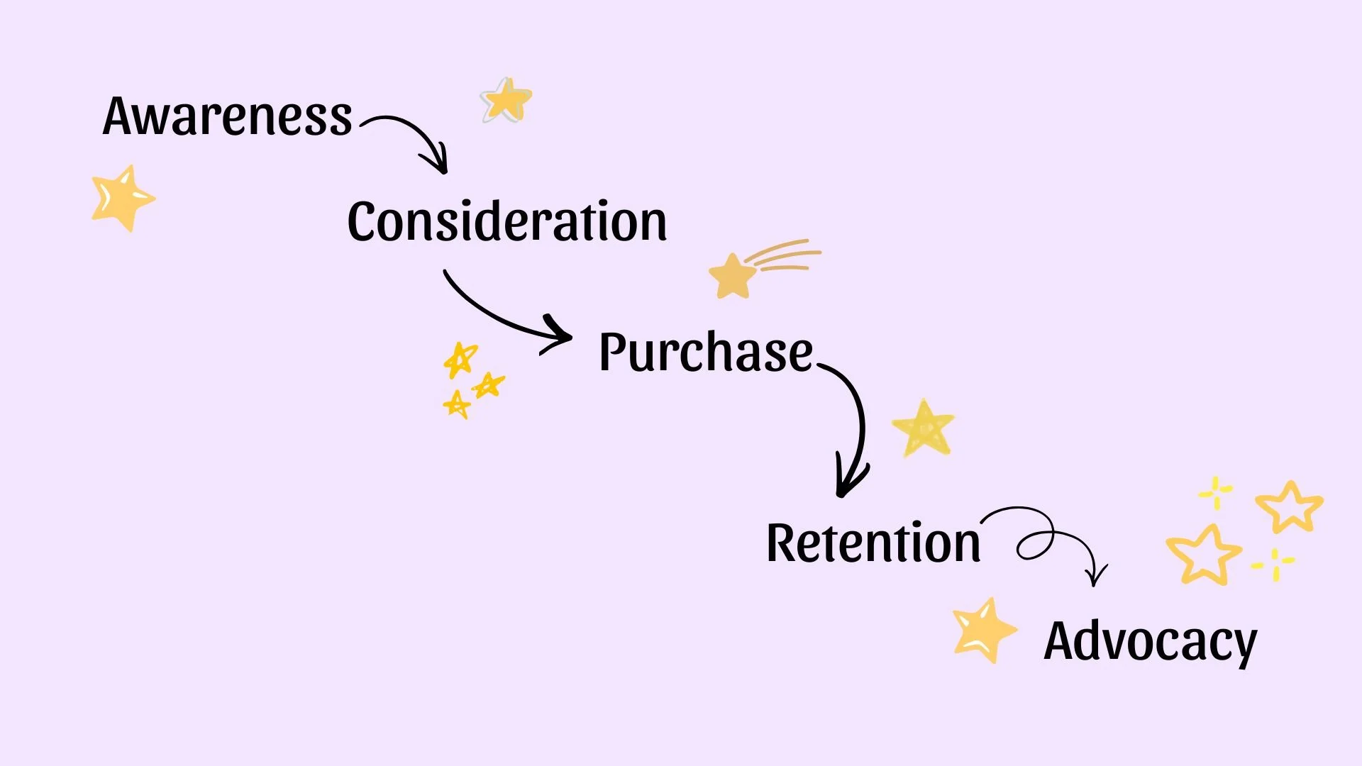 5 stage model of the customer journey showing awareness, to consideration, to purchase, to retention, to advocacy.